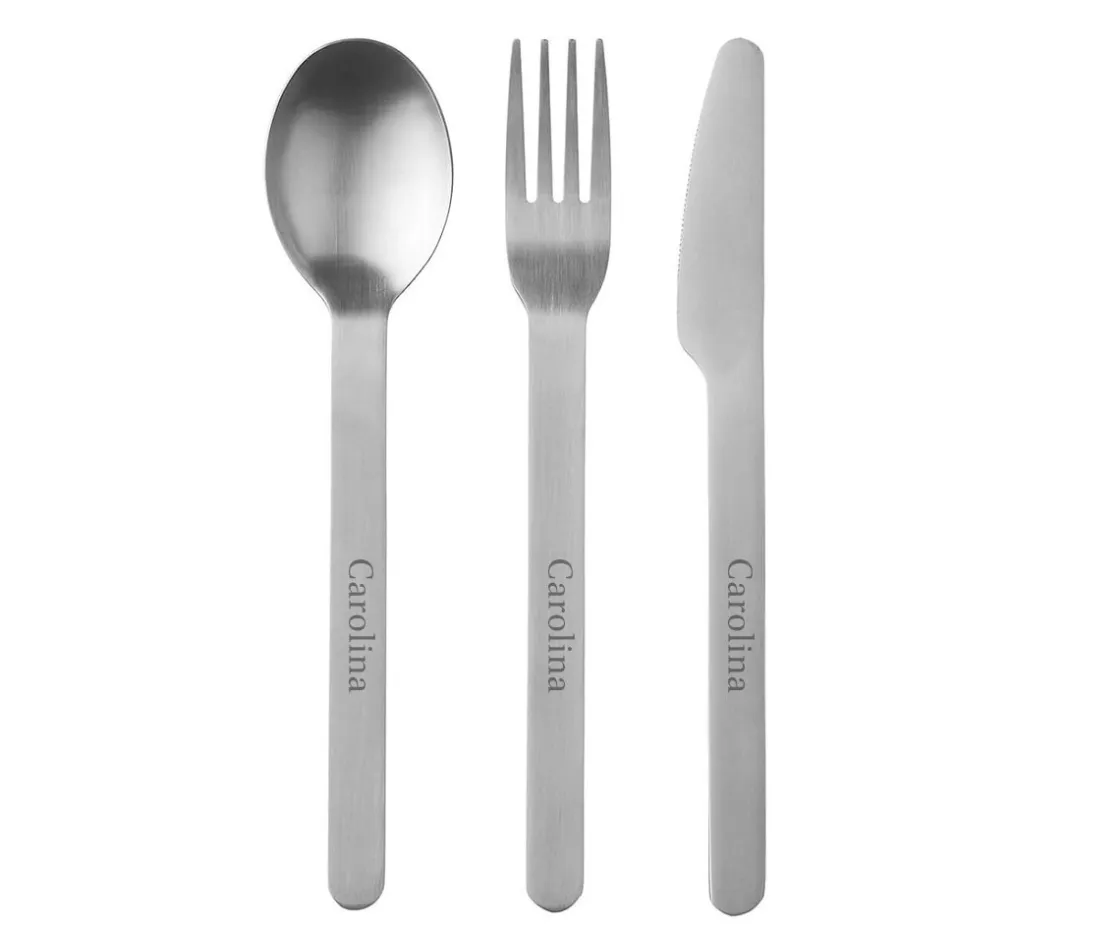 Este práctico set de cubiertos consta de un cuchillo, un tenedor y una cuchara unidos por un soporte de plástico.