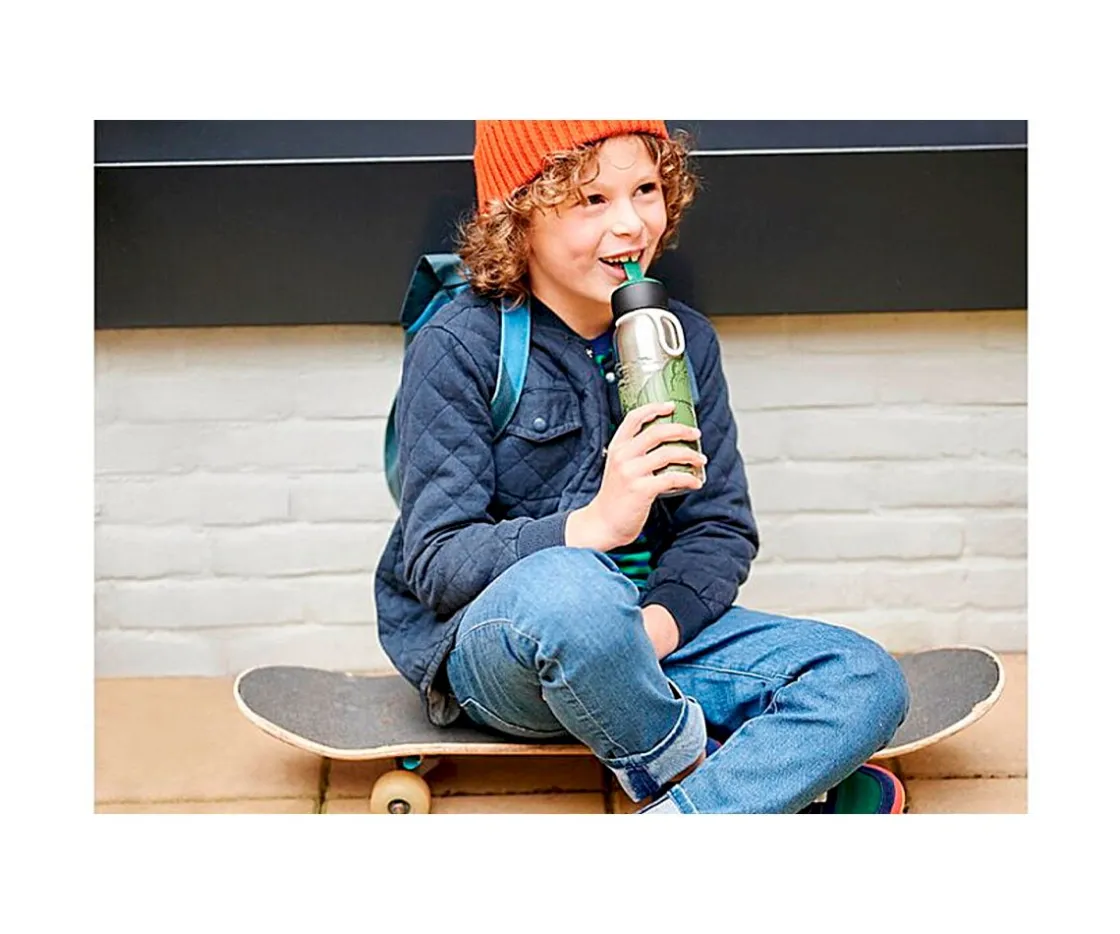 Esta botella de acero mantendrá la bebida de tu peque fresquita durante más tiempo. La botella tiene un práctico sistema abatible, fácil de usar incluso por los más pequeños. ¡Simplemente levante el pitorro y listo para beber! Cuenta con una pajita en el interior. Además, lleva un clip para poder colgarla del cinturón o en una bolsa. Esto evitará que la bolsa se moje si a alguna gota se le ocurre escapar de la boquilla después de beber.