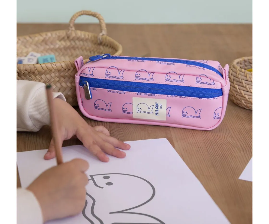Estuche rectangular de la colección 460 Since 1918 de MILAN perfecto para acompañar a los peques en su día a día escolar. Incluye dos compartimentos con cremallera azul, uno principal y un práctico bolsillo frontal, ideales para mantener lápices, bolígrafos, gomas y pequeños accesorios bien organizados.