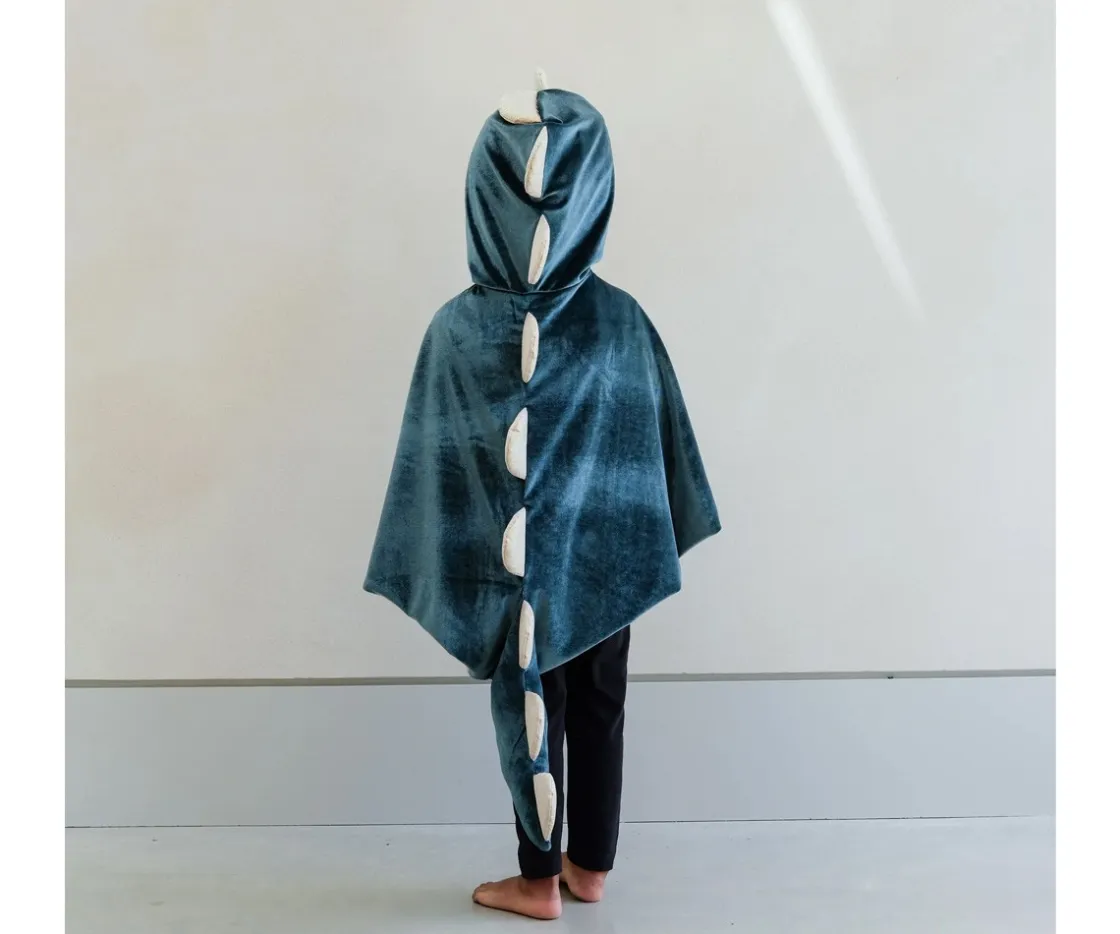 Una capa con capucha, cola y espinas festoneadas con purpurina con el que tu peque será el dinosaruio más aterrador de la fiesta.