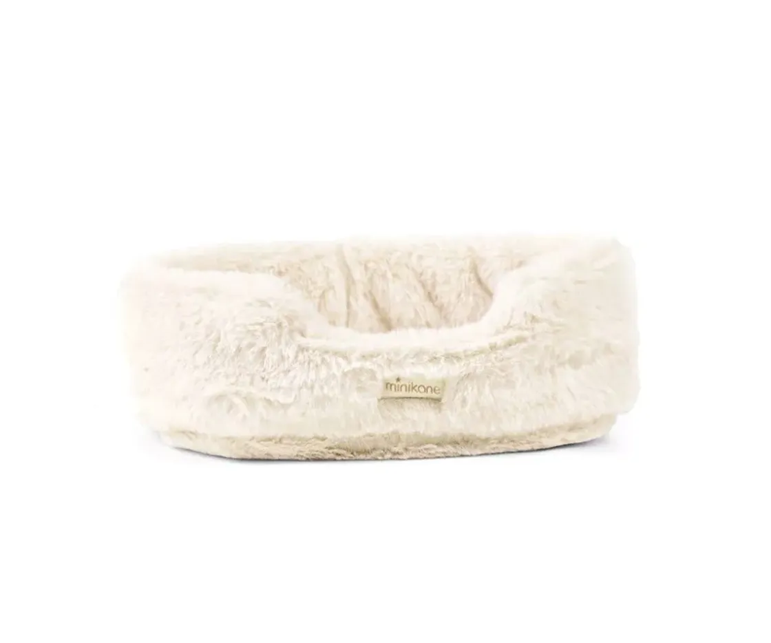 Lleva puesto un collar identificativo y está acompañado de su suave camita en la que le encanta descansar.