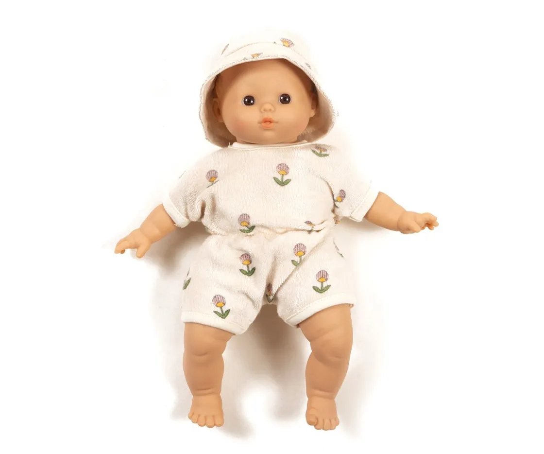 Tus muñecos Minikane Soft irán muy cómodos con este mono de felpa de tejido de rizo suave y estampado de flores.