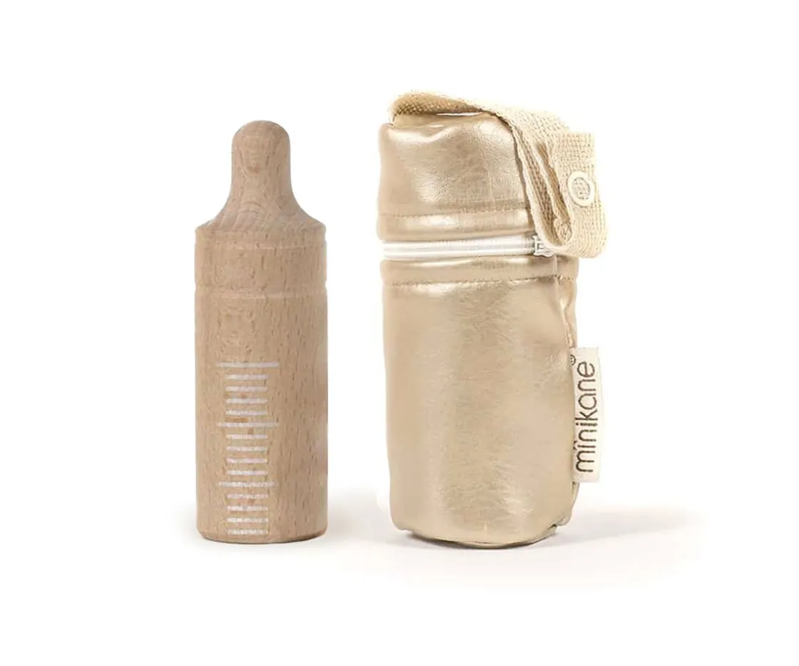 Precioso portabotellas de algodón acolchado con biberón de madera graduado, para que los peques puedan alimentar a sus muñecos preferidos.