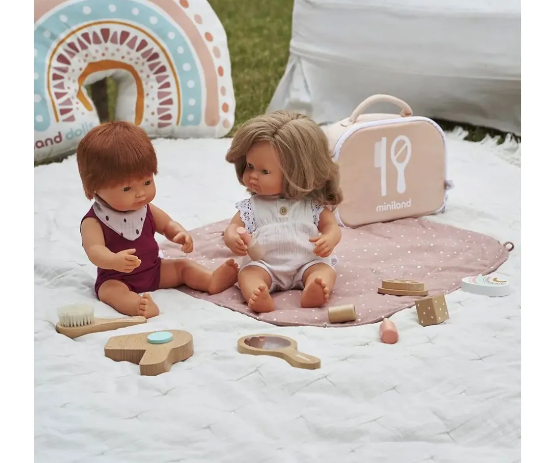 Este original set de belleza de madera está compuesto por un secador de pelo, esmalte de uñas, pintalabios, espejo, cepillo para el pelo y 3 sombras de ojo. Todas estas piezas los peques las podrán transportar en su maletín a cualquier lugar para su disfrute.