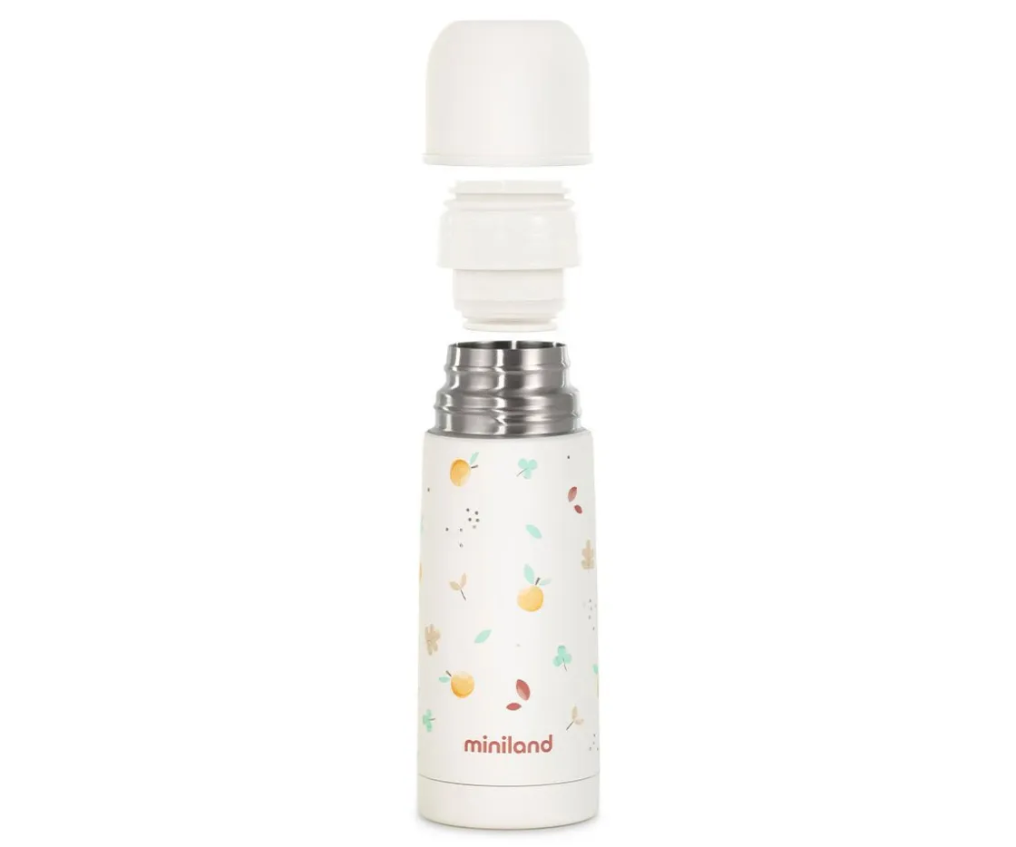 Este termo de acero inoxidable Thermy de la colección Valencia de Miniland,mantendrá los líquidos fríos o calientes durante mucho tiempo,gracias a su innovadora triple capa aislante, para que puedas preparar el biberón de tu peque en cualquier parte.
