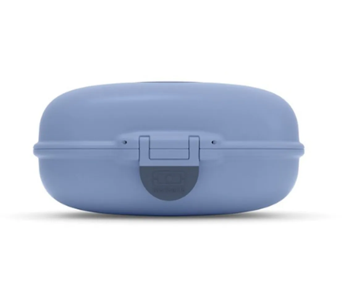 Con un look marcado por su lengüeta de cierre, esta snack box de formas divertidas puede personalizarse gracias a sus pegatinas intercambiables.