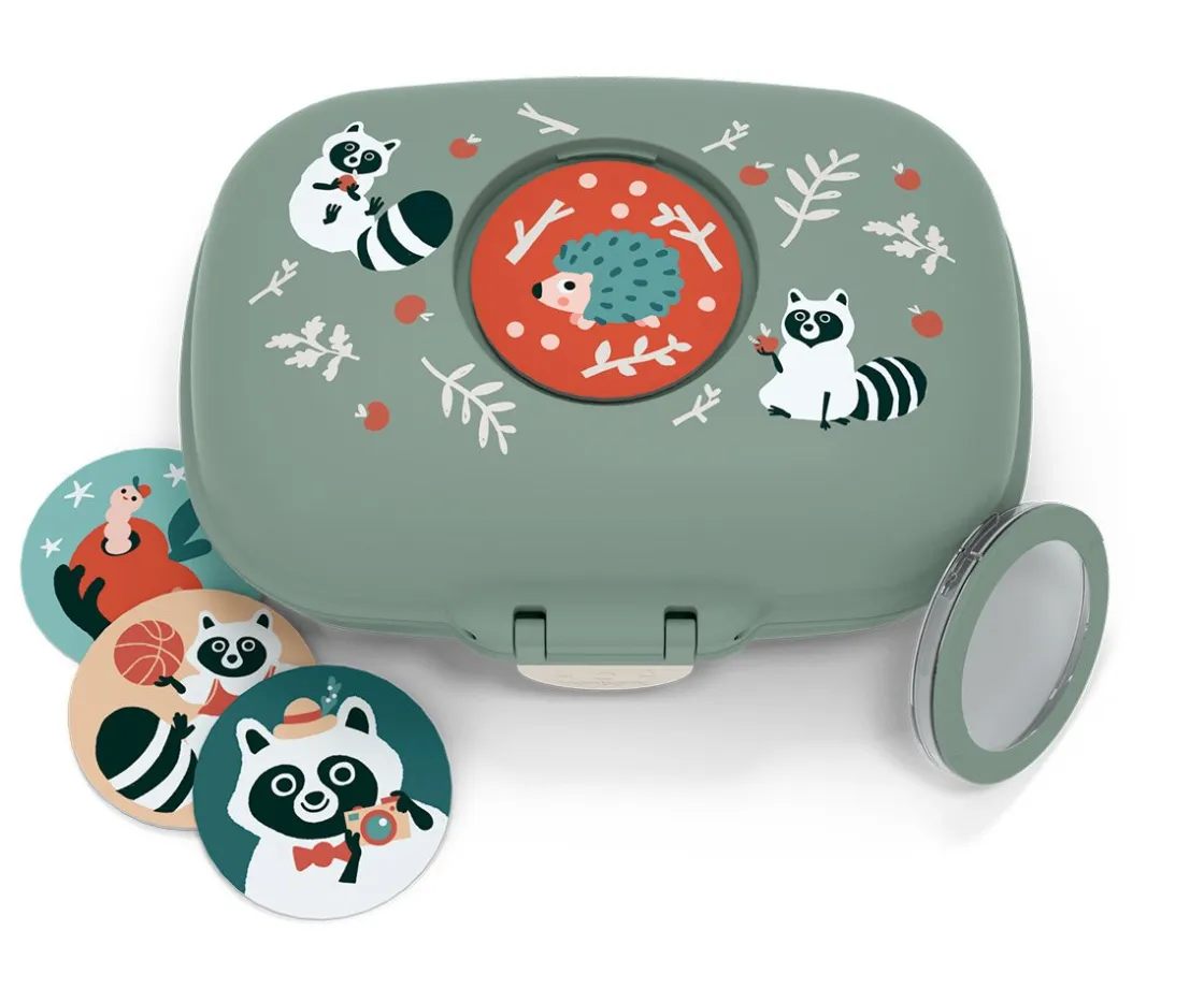 Con un look marcado por su lengüeta de cierre, esta snack box de formas divertidas puede personalizarse gracias a sus pegatinas intercambiables.