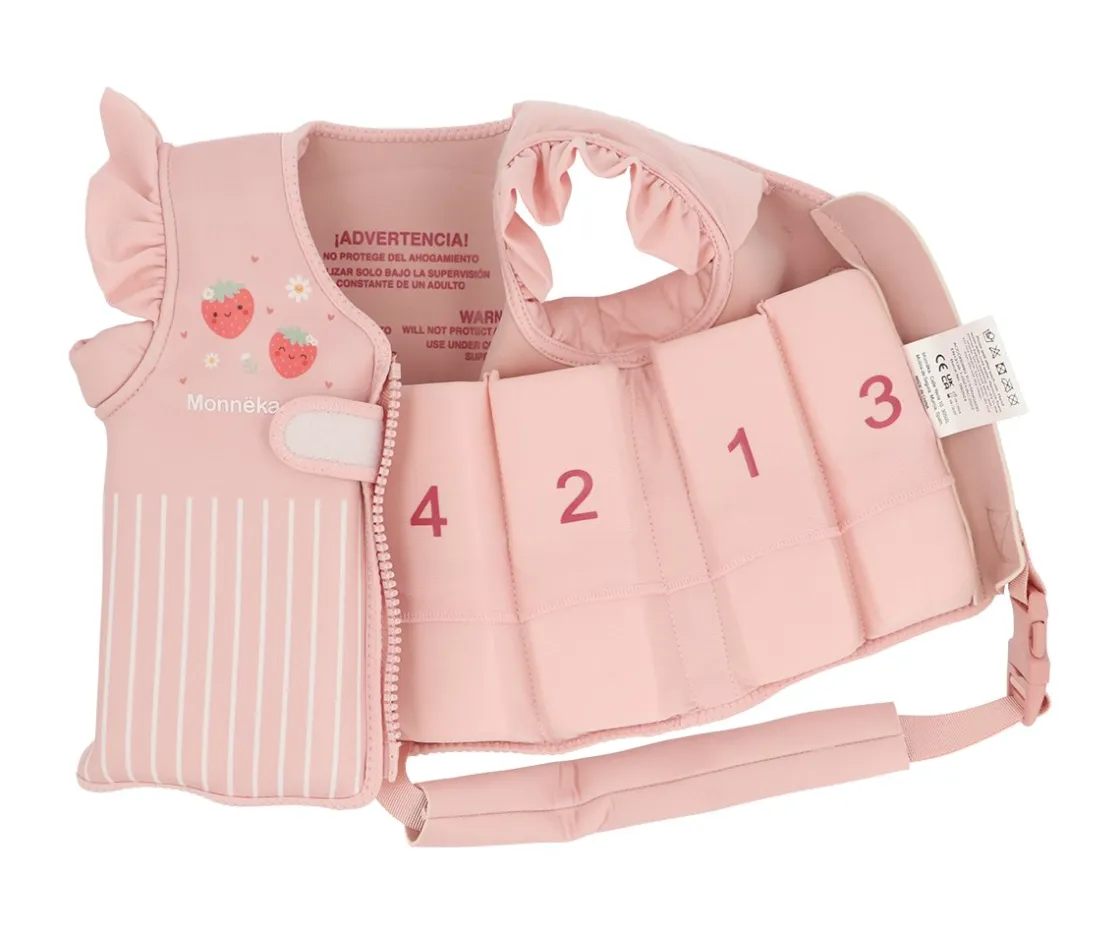 Descubre el adorable chaleco flotador de la colección Strawberries que cuenta con una cinta con cierre de seguridad para colocar entre las piernas con el fin de que el chaleco no se salga por la cabeza, en caso de tirarse al agua de manera vertical o cuando, simplemente, está flotando en el agua.Además está protegida con neopreno para evitar rozaduras entre las piernas.