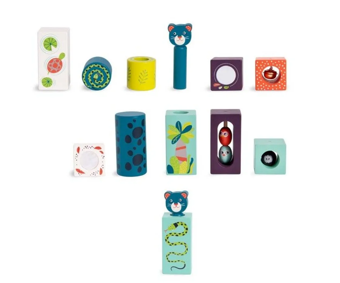 Este bonito conjunto de bloques apilables de la colección «en la jungla» de Moulin Roty ayuda a estimular la curiosidad de los más pequeños. Con sus diferentes colores, cascabales incorporados y espejos, tu pequeño se verá estimulado y podrá experimentar el mundo que le rodea.