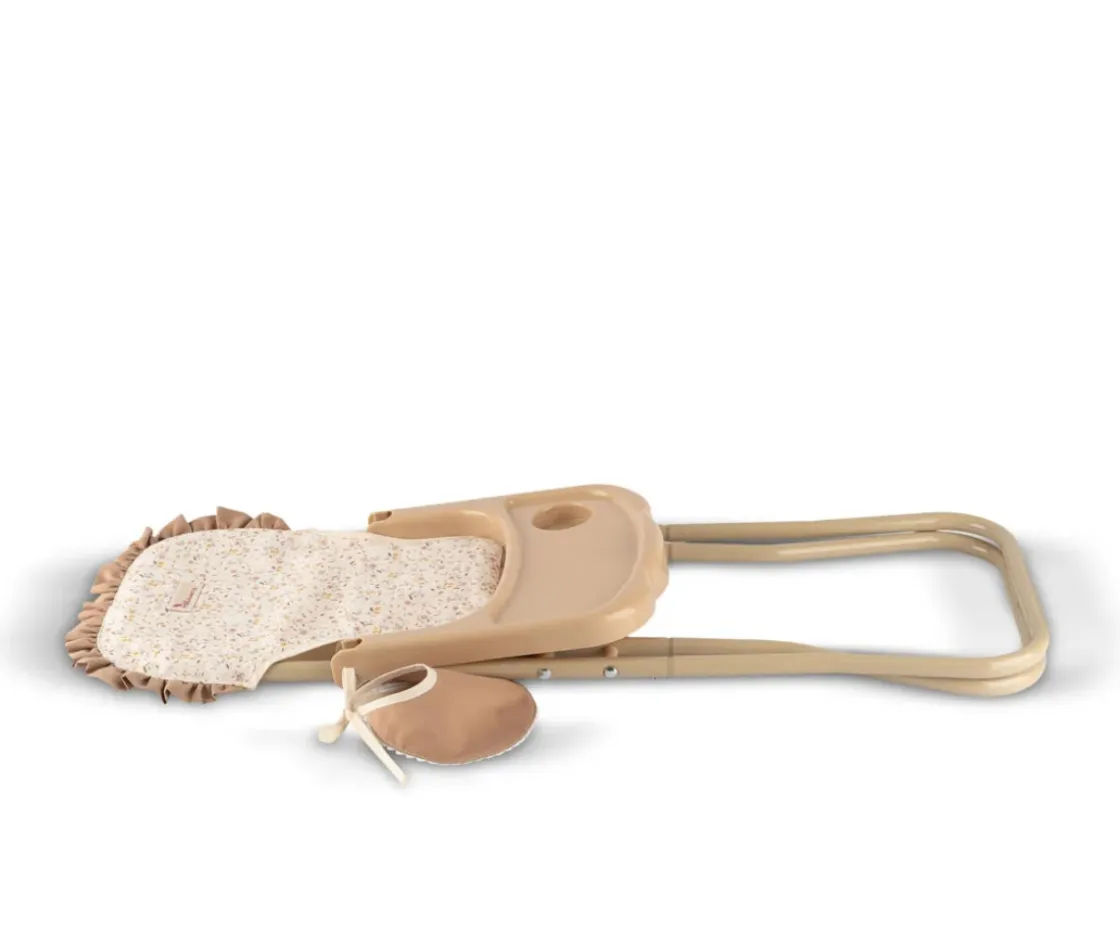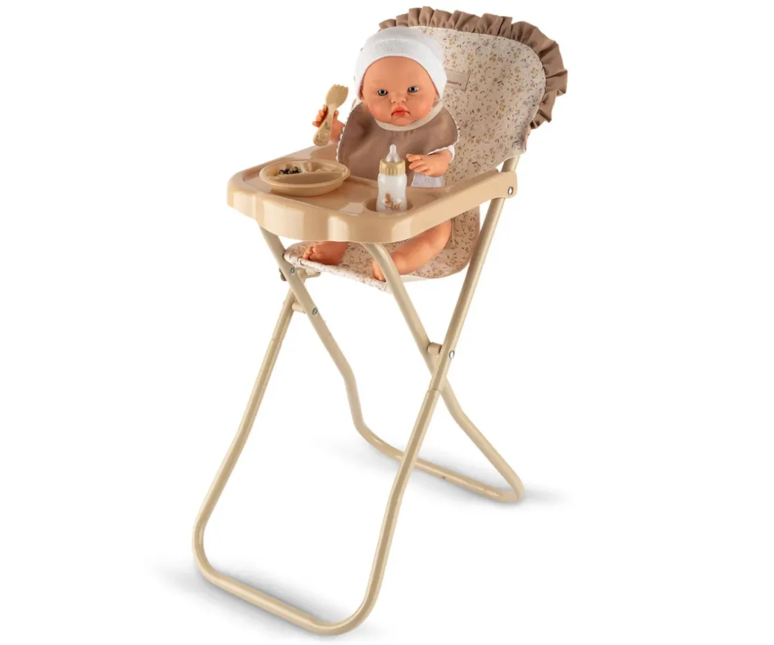Sienta a tus muñecas a la hora de comer en la trona con bandeja, con un estampado de la colección Teresa. Además incluye un babero para que tus muñecas no se manchen.