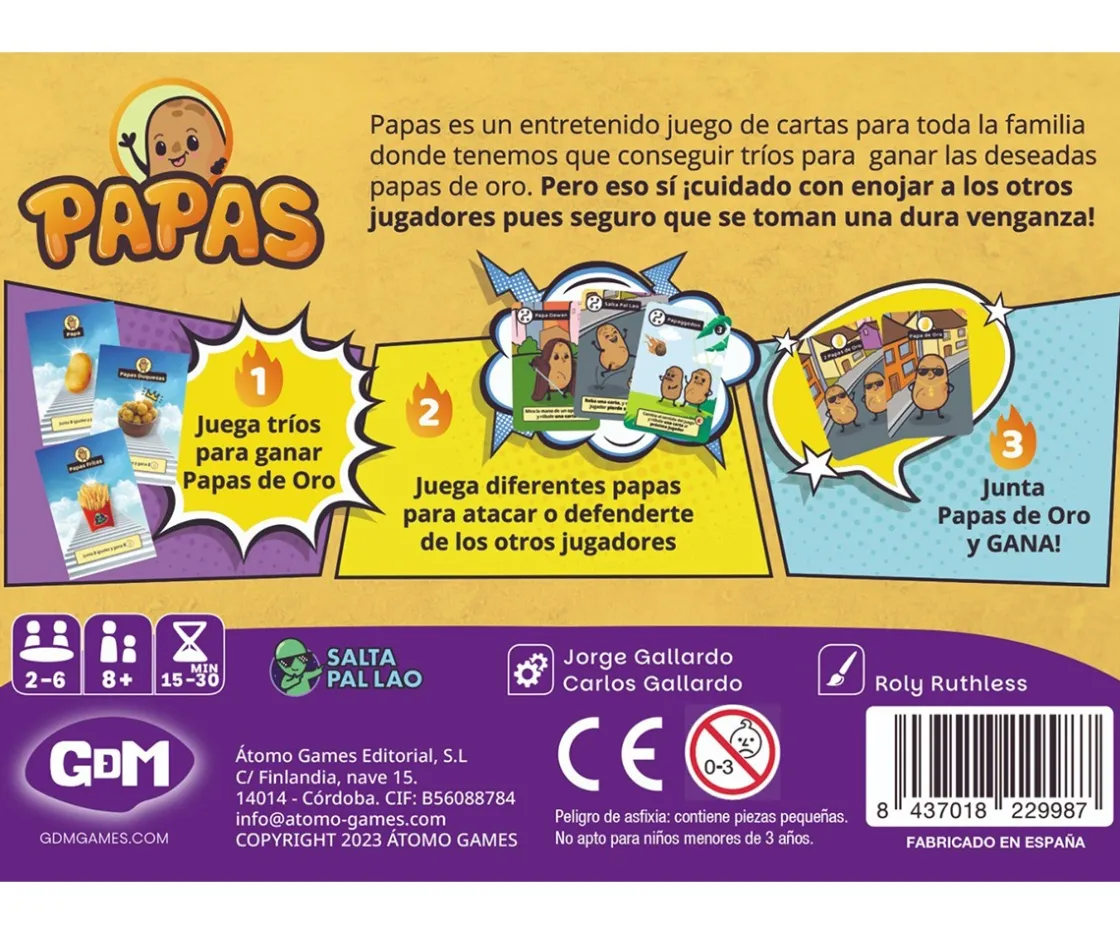 Papas de Átomo, es un entretenido. Un juego de cartas familiar, en el cual tendrás que juntar la mayor cantidad de Papas de Oro. Para esto tendrás que jugar papas para atacar o defenderte.