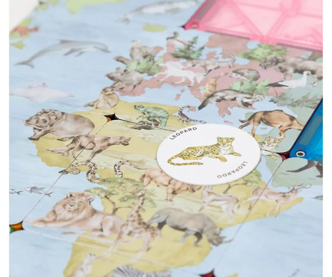 Imanix Speedy Eye contiene piezas de construcción magnéticas y un puzzle magnético con la imagen del mapamundi habitado de animales, de manera que tendrás 2 juegos en 1.