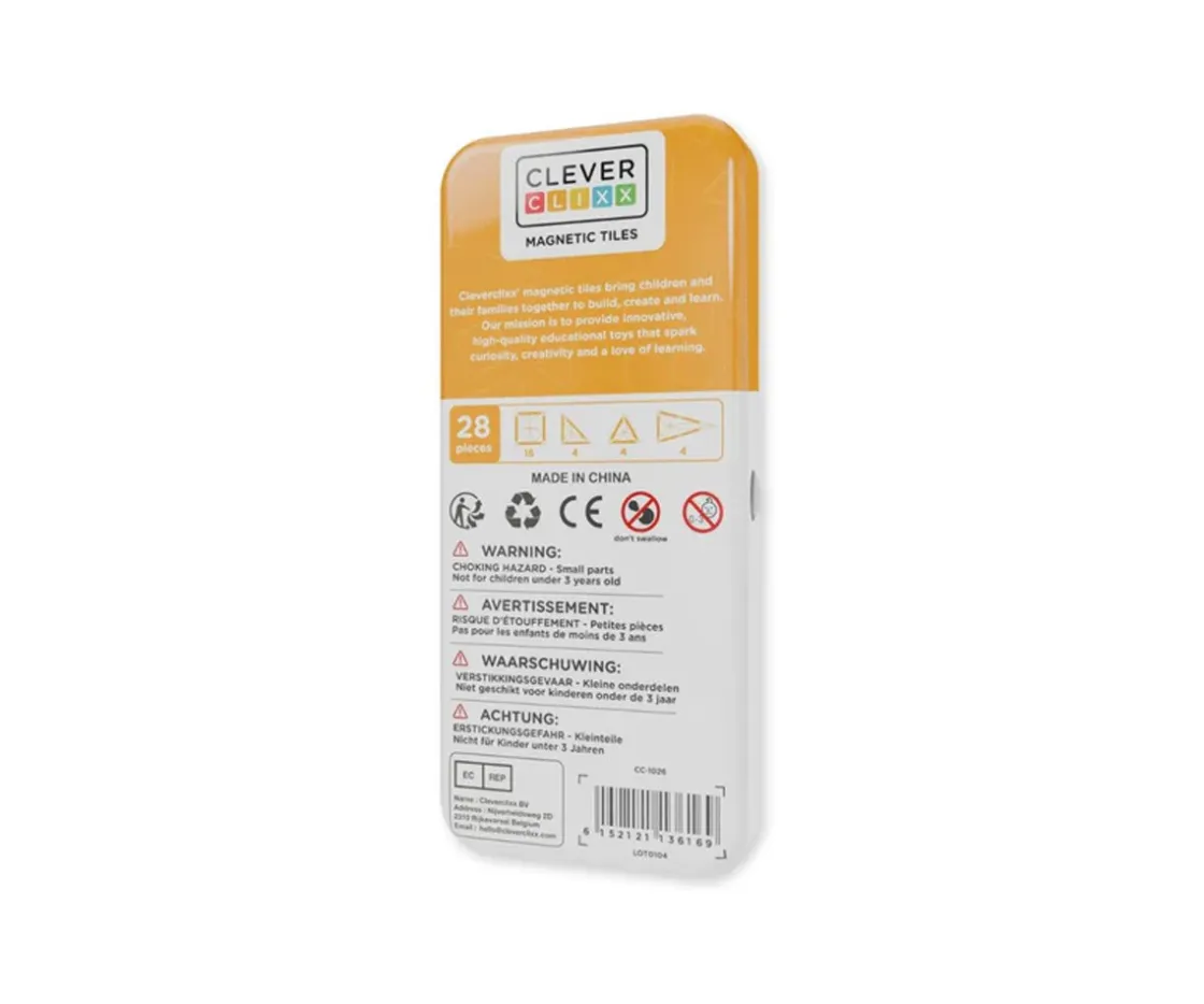 El set Mini Tiles Pack de Cleverclixx incluye 28 piezas magnéticas en un práctico formato mini, ideal para pequeñas manos y grandes ideas. Diseñado para peques a partir de 3 años, este pack fomenta el juego libre, el desarrollo de habilidades STEAM y la creatividad, ¡estés donde estés!