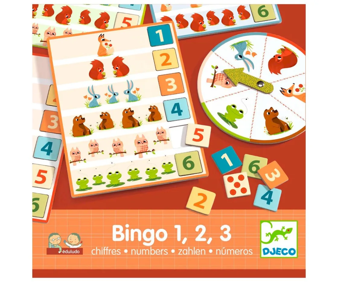 Juego de Bingo de la marca Djeco, un juego de asociación y colección sobre los números y los animales del bosque.