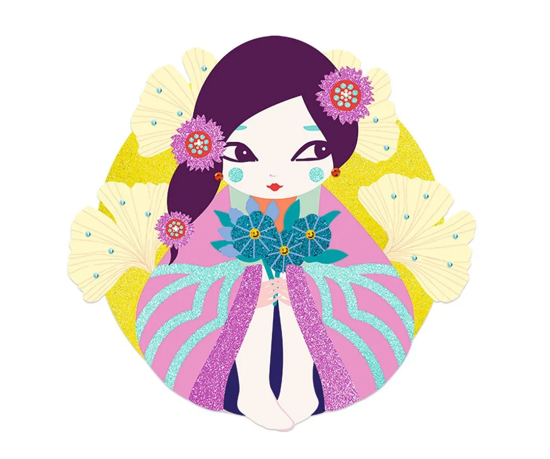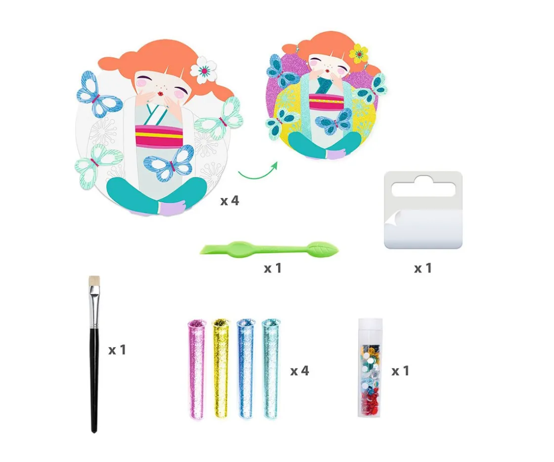 - Incluye: 4 tarjetas impresas y con adhesivos de forma redonda (21 cm de diámetro), 4 tubos de purpurina, 1 juego de mini lentejuelas, 1 herramienta de plástico, 1 pincel brocha, 4 ganchos adhesivos, 1 folleto explicativo