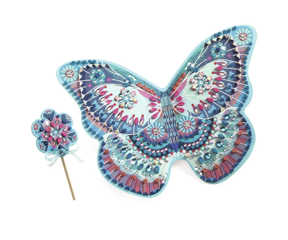 Fabuloso kit DIY Djeco, para crear unas alas de hada y una varita mágica con preciosas pegatinas y diamantes brillantes. Las alas pueden llevarse en la espalda, convirtiéndose en un complemento ideal para fiestas de disfraces.
