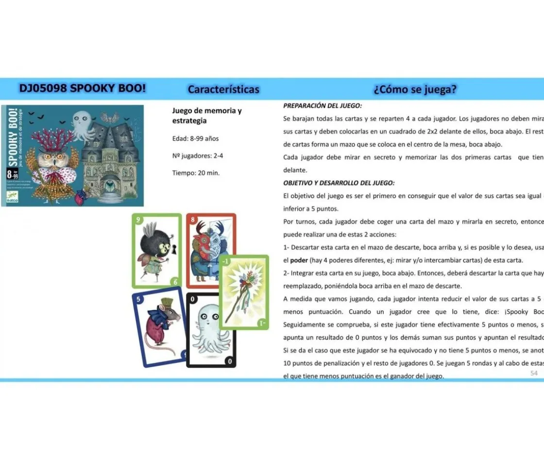 Con el juego de cartas Spooky Boo! de Djeco tendrás un divertido desafío: lograr que el valor de tus cartas sea igual o menor de 5.