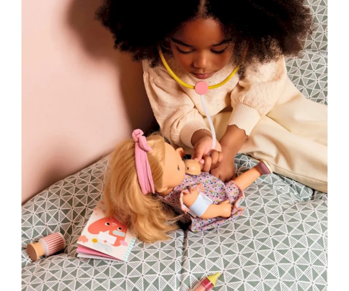 Marie viste un bonito vestido de motivos florales, unos zapatos muy conjuntados y una banda para recoger su larga melena rubia. Tiene unos preciosos ojos azules que se abren y cierran cuando la muñeca esta en vertical o en horizontal. Además, tiene su cuerpo totalmente articulado y fabricado en vinilo, para aportar suavidad y facilitar su limpieza.