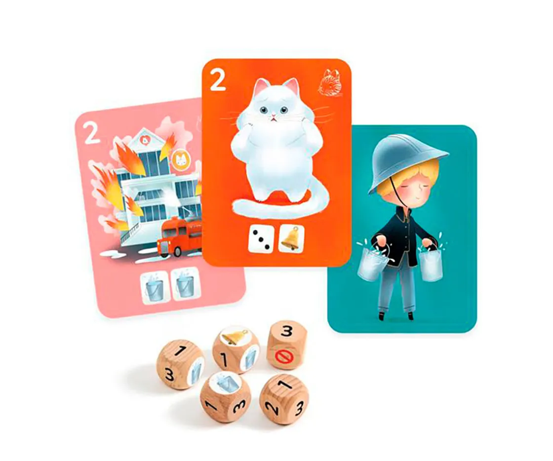 - Incluye: 3 dados personalizados, 36 cartas temáticas (animales, fuego, rescate), tablero ilustrado con la clínica veterinaria, instrucciones detalladas, cajita tipo cajón para guardar y transportar todas las piezas