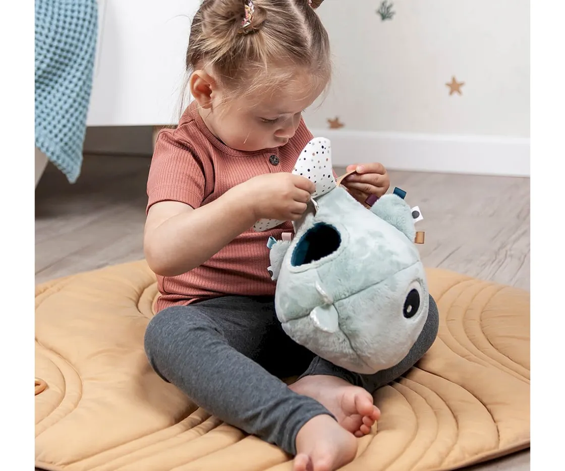 Wally y tres pequeños bebés pececitos con diferentes sonidos y texturas harán que tu peque estimule sus sentidos. Un juguete dónde desarrollará sus habilidades de concentración y coordinación mano – ojo. Los pececitos se pueden introducir en la barriga de esta bonita ballena, descubrirá un espejito en su aleta y sentirá las diferentes texturas que le rodea.