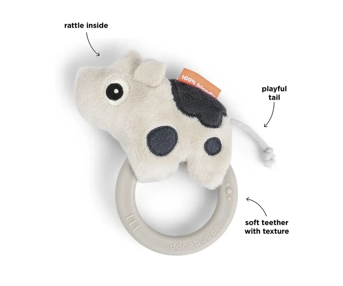 Esta bonita vaca de Done by Deer, es un mordedor y un sonajero, el peque mientras manipula a la vaca Dotti escuchará un suave tintineo de un cascabel en su interior. La anilla del mordedor le servirá para aliviar sus encías.