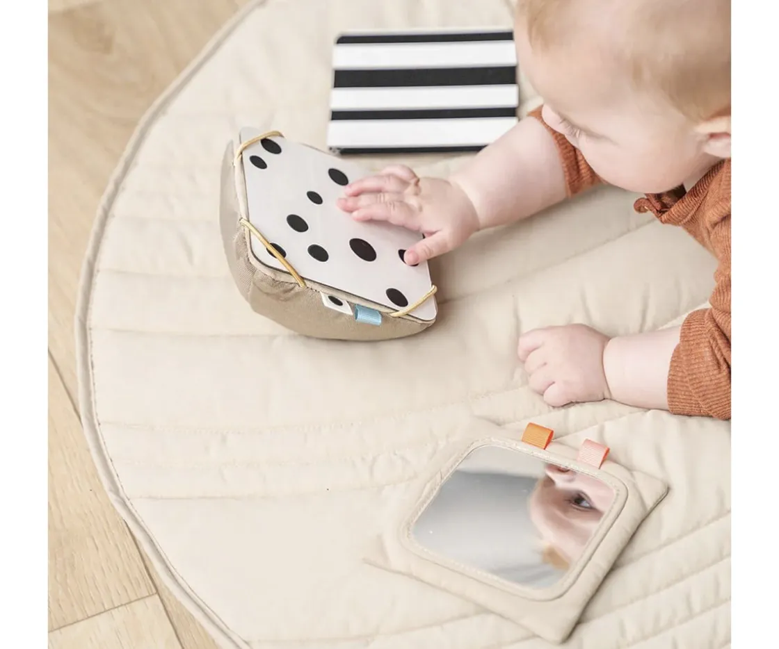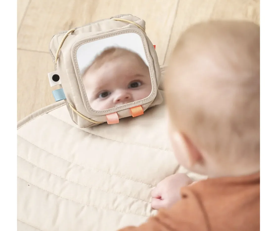 Este suave porta tarjeta con espejo fomentará la exploración visual desde el nacimiento del bebé y su oído con la campanita en su interior.