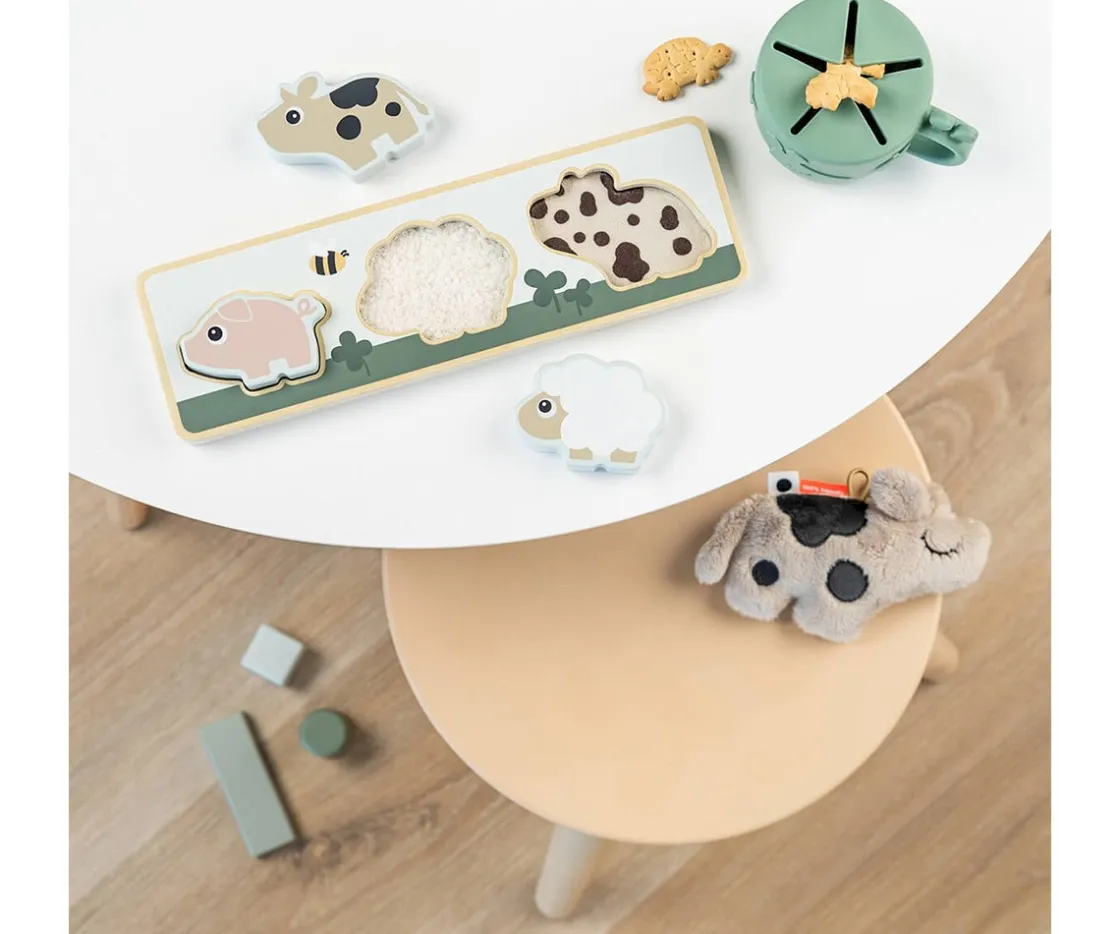 Divertido puzzle sensorial de la colección Tiny Farm de Done by Deer, el peque descubrirá a los 3 amigos de la granja: el cerdito Pigee, la vaca Dotti y la oveja Sheepy.
