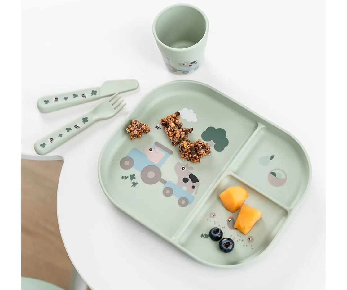 Incluye un plato compartimentado con base de succión antideslizante, una vaso de aprendizaje con base antideslizante y un set de cubiertos ergonómicos. Perfecto para fomentar la autonomía y mantener la comida en su sitio.