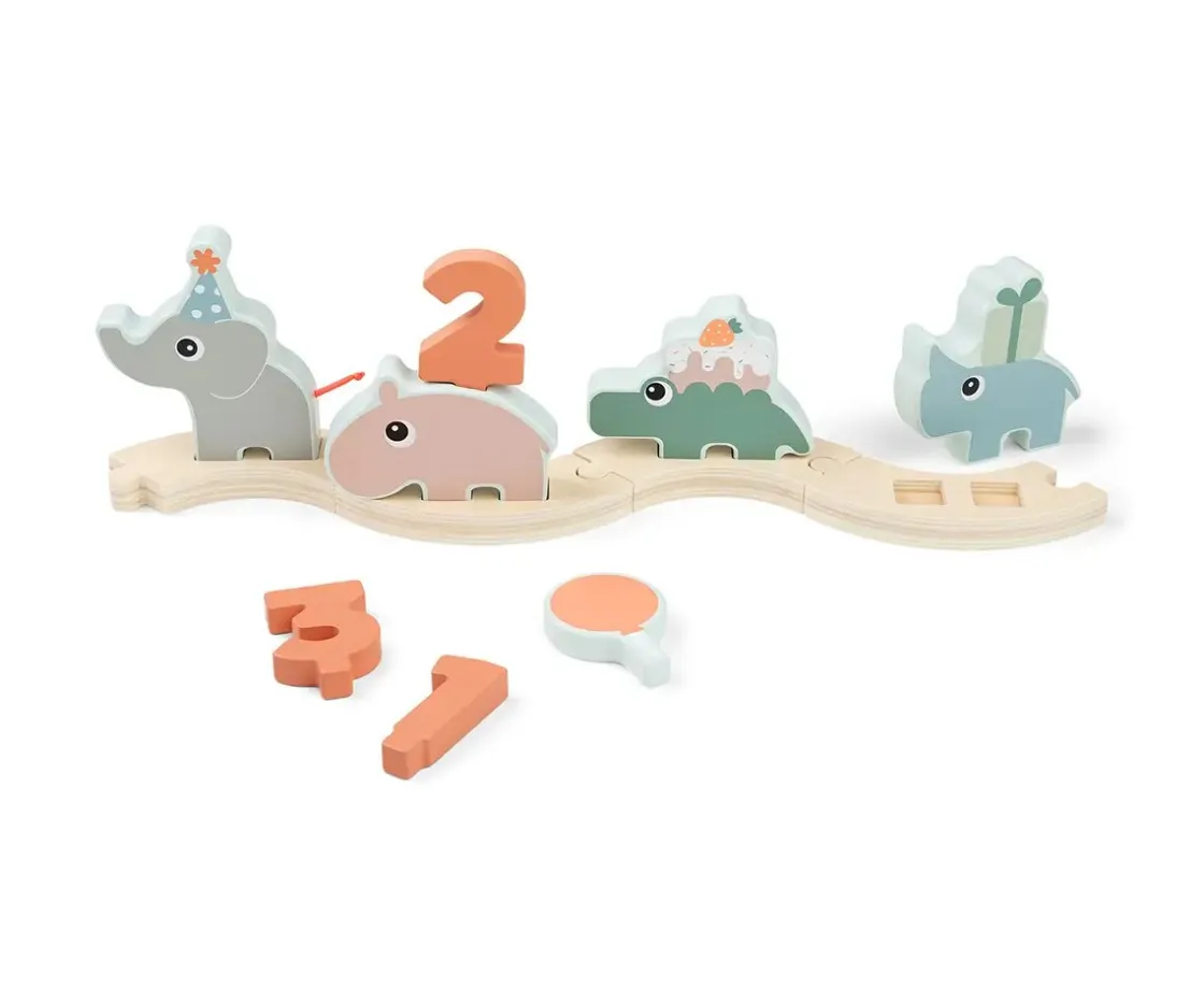 La original tarta de cumpleaños de madera de Done by Deer está decorada con los amiguitos Deer e incluye los números del 1 al 3 y un globo que puedes colocar sobre uno de los amiguitos Deer.