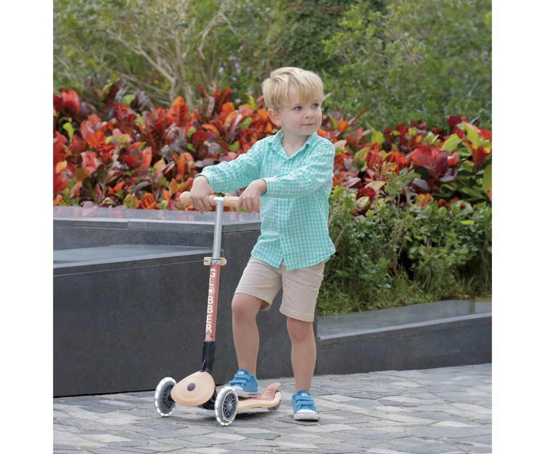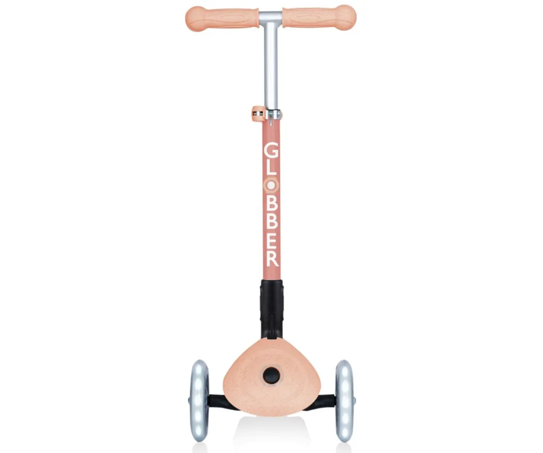 El patinete infantil Junior Foldable Lights es ecológico y está fabricado con un 60% de plástico reciclado. Tiene 3 ruedas, bloqueo de dirección y un sistema de plegado y barra en T ajustable. La misma estructura pero con materiales más ecológicos.