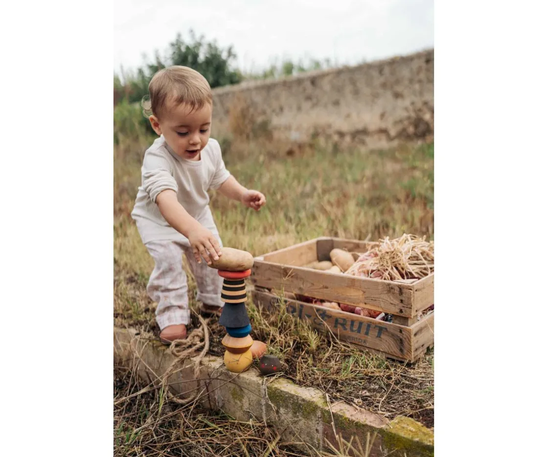 A los peques les encantará apilar una y otra vez, realizando variadas combinaciones las 8 piezas de madera de diferentes colores y formas de Grapat.
