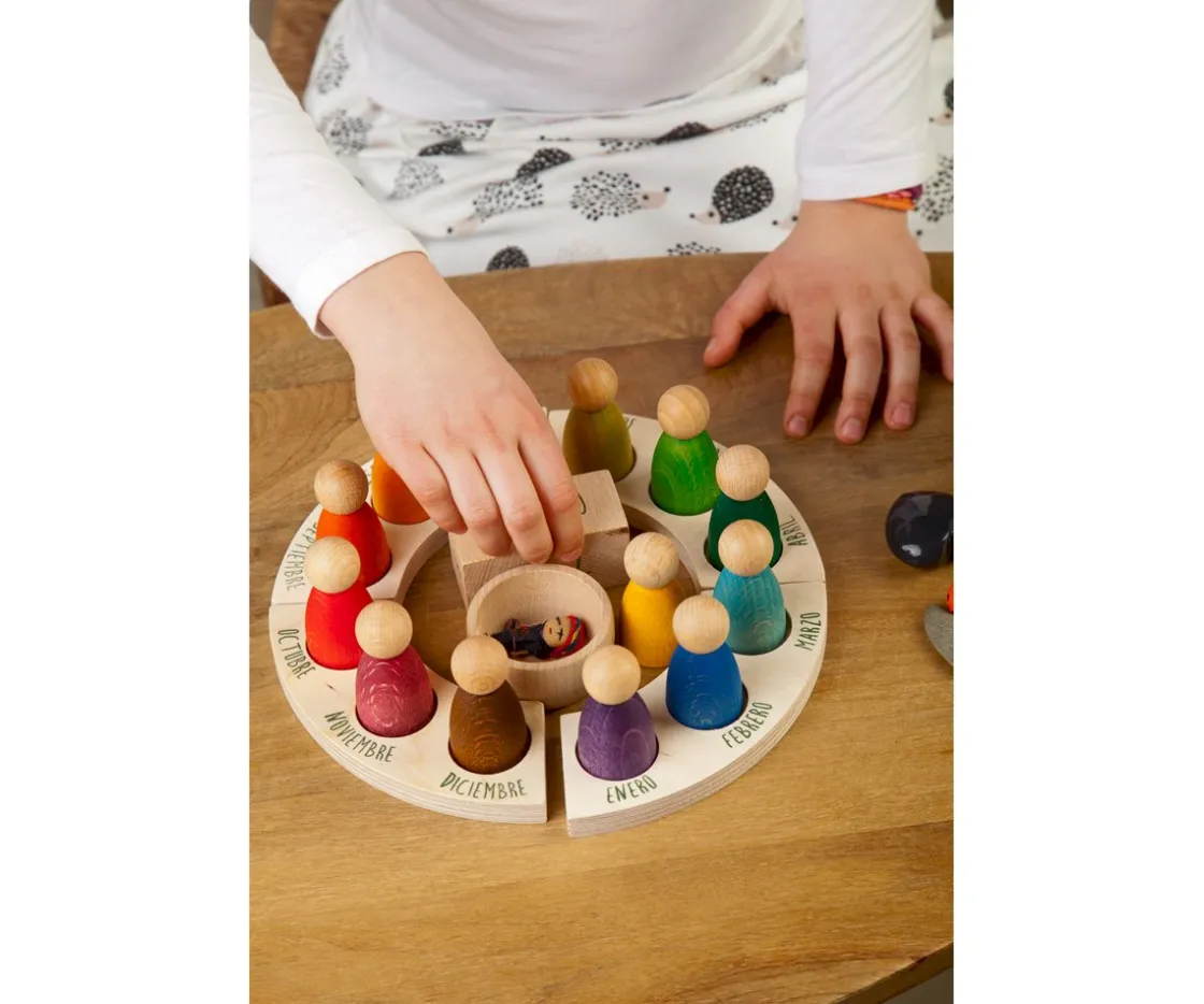 Calendario manipulativo y activo anual que permite al niño tocar el año y comprender el paso del tiempo a través de la experiencia.