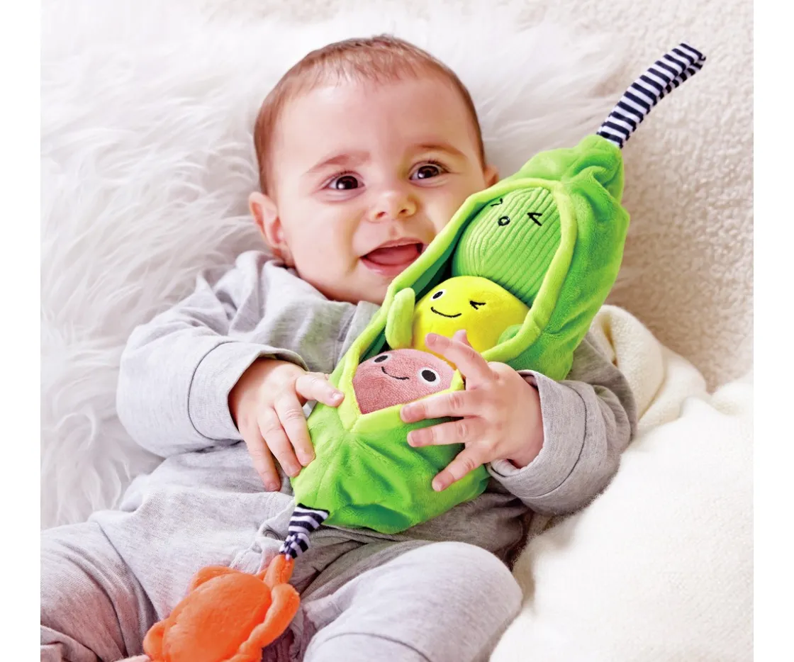 Una vaina con 3 guisantes de colores con diferentes texturas,sonidos y etiquetas que los peques irán descubriendo al tiempo que ejercitan el agarre y la motricidad fina, al agitarlos y estrujarlos.