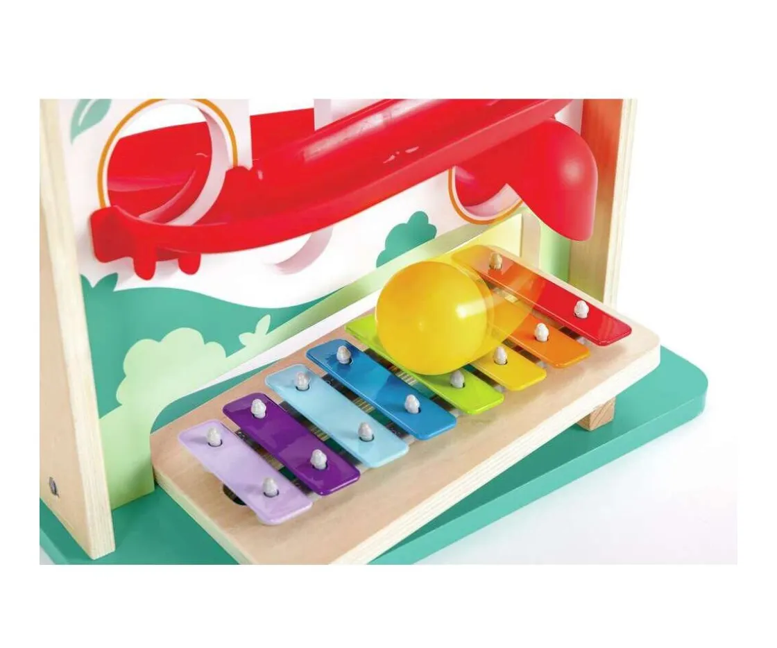 Las bolas caerán por el colorido circuito tocando el xilófono al final del mismo, para los peques será emocionante y muy divertido observar y entender la causa y el efecto. Para que las bolas caigan a través del circuito los peques deberán golpearla con el martillo incluido.