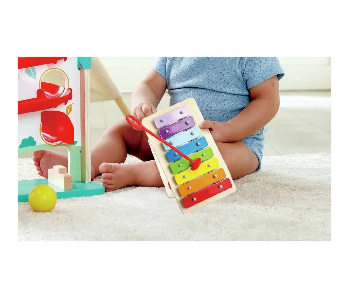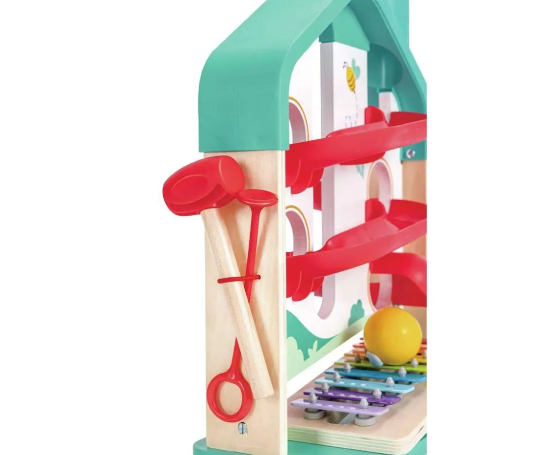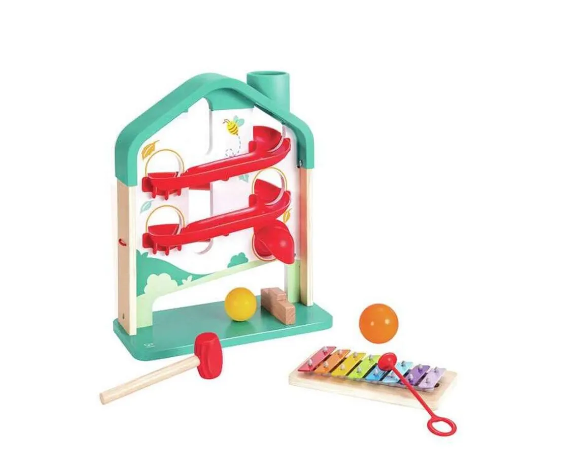- Incluye: circuito de bolas con xilófono incluido, martillo, varita para tocar el xilófono, 2 bolas