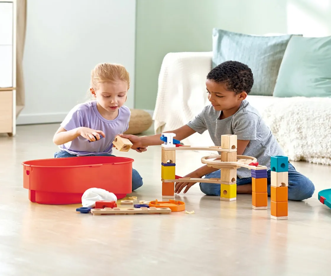 Los bloques de madera vienen perforados con entradas y salidas para las canicas, lo cual ayuda a potenciar el pensamiento espacial en niños y niñas a partir de los 4 años.