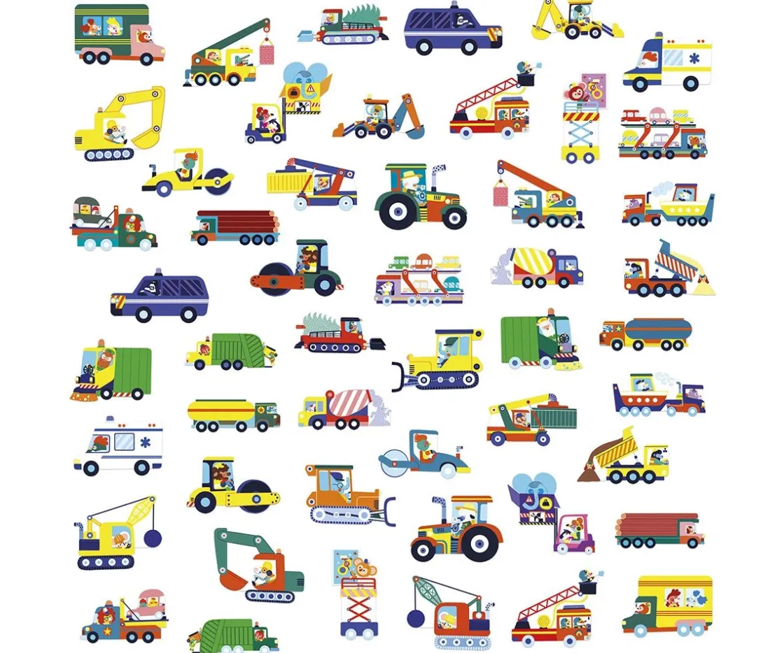 El tamaño de las pegatinas ha sido diseñado para las manos de los peques, que podrán cogerlas y pegarlas con facilidad. Explora todo tipo de vehículos y maquinaria de construcción con Janod.