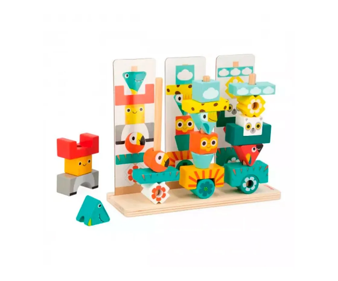 Un juego que desarrollará la observación a la vez que consiguen destreza apilando las distintas piezas según el modelo de totem que aparezca en las fichas.