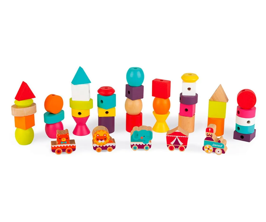 Con este divertido juguete tendrás 2 juegos en 1. Para los peques más pequeños 5 figuritas de mader maciza para contar un montón de historias, y para los más grandes cuentas para enhebrar que desarrollarán su motricidad.