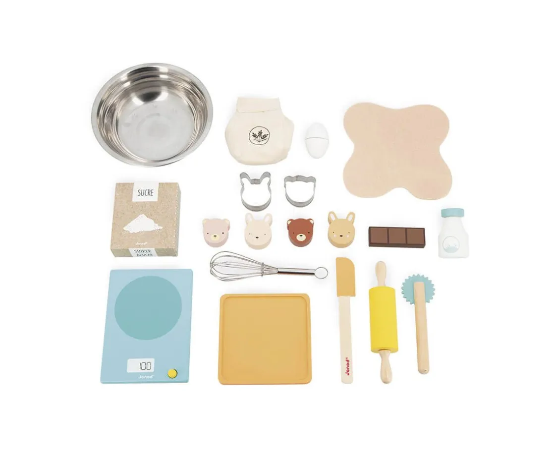 - Incluye: báscula de madera, un huevo con cierre de velcro, una barra de chocolate, un bol, batidor de metal, masa de fieltro, rodillo, espátula, cortapastas dentado, 2 moldes de metal con cabeza de osito y cabeza de conejito.