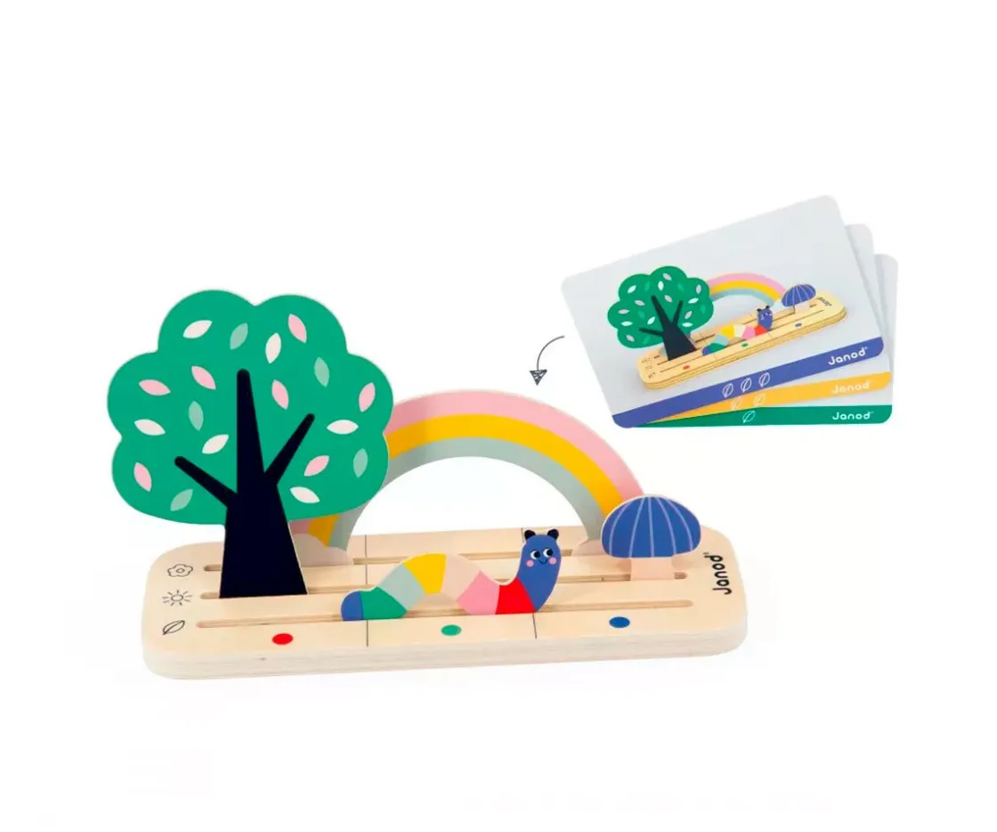 ¡Asimilar lo que aprende en el cole de forma divertida es lo que promete este bonito juguete educativo de madera! ¡Ayudará a los más pequeños a entender el concepto de orientarse en el espacio y a ampliar su vocabulario! Todo listo para dar un buen paseo por el jardín en compañía de nuestras 8 piezas de madera con forma de personajes y elementos de la naturaleza: caracol, mariquita, árbol, oruga… Utilizando las 12 tarjetas de ejemplo de dos caras, los niños a partir de 3 años tendrán que reproducir la escena en el soporte de madera y, al mismo tiempo, adquirirán el vocabulario en cuestión: a la izquierda o a la derecha, delante o detrás, al lado de… Además ejercitarán su capacidad de observación. Hay 3 niveles de dificultad representados por los colores de las cartas.