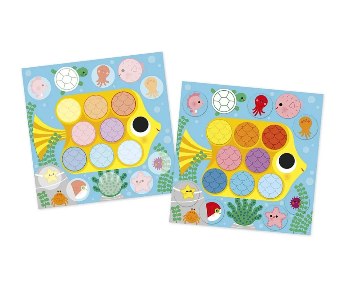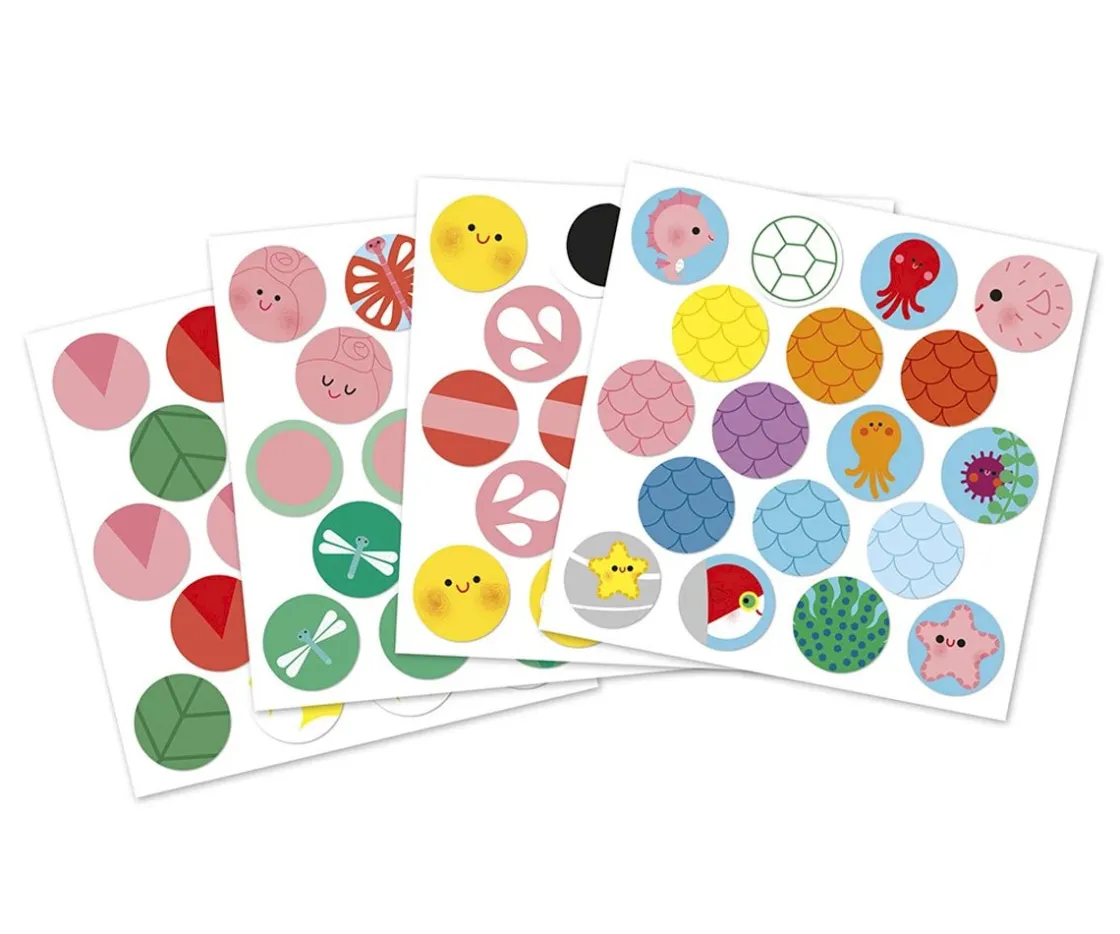 - Incluye: 4 dibujos para decorar(1 rana en su nenúfar, 1 pez en el agua, 1 mariposa, 1 oruga), 4 hojas de pegatinas (72 en total), 1 hoja de instrucciones