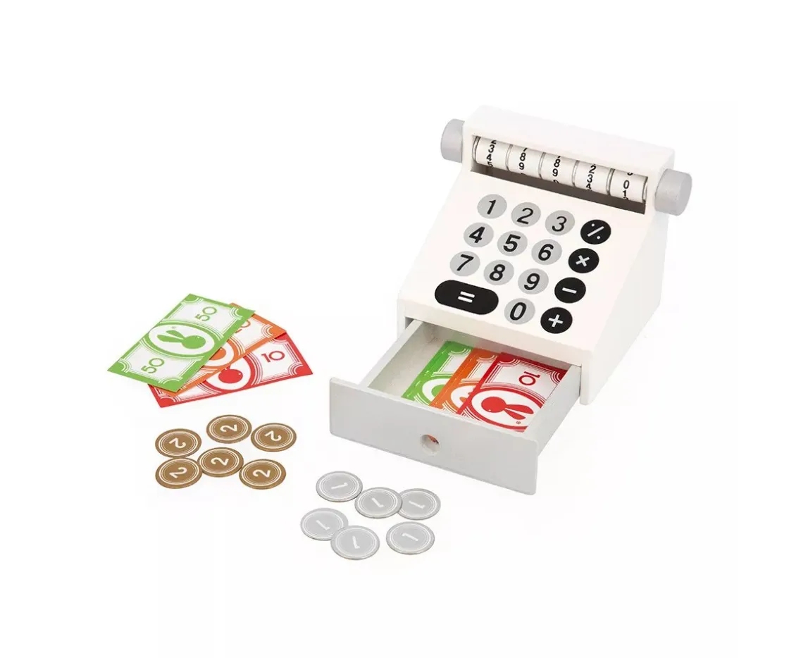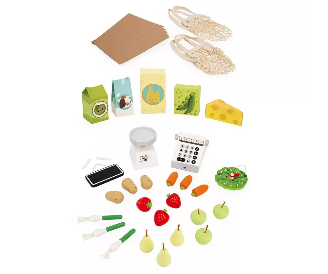 - Incluye: Puesto de venta, frutas y verduras (3 zanahorias, 3 patatas, 3 puerros, 3 fresas, 3 manzanas y 3 peras) 5 alimentos envasados (guisantes, harina, leche, zumo de manzana y queso) equipamiento de venta (1 reloj, 1 báscula, 1 caja registradora con 9 billetes y 12 monedas, 1 pizarra con 2 tizas) y kit de compra (6 bolsitas de papel kraft y 2 redes de tela)