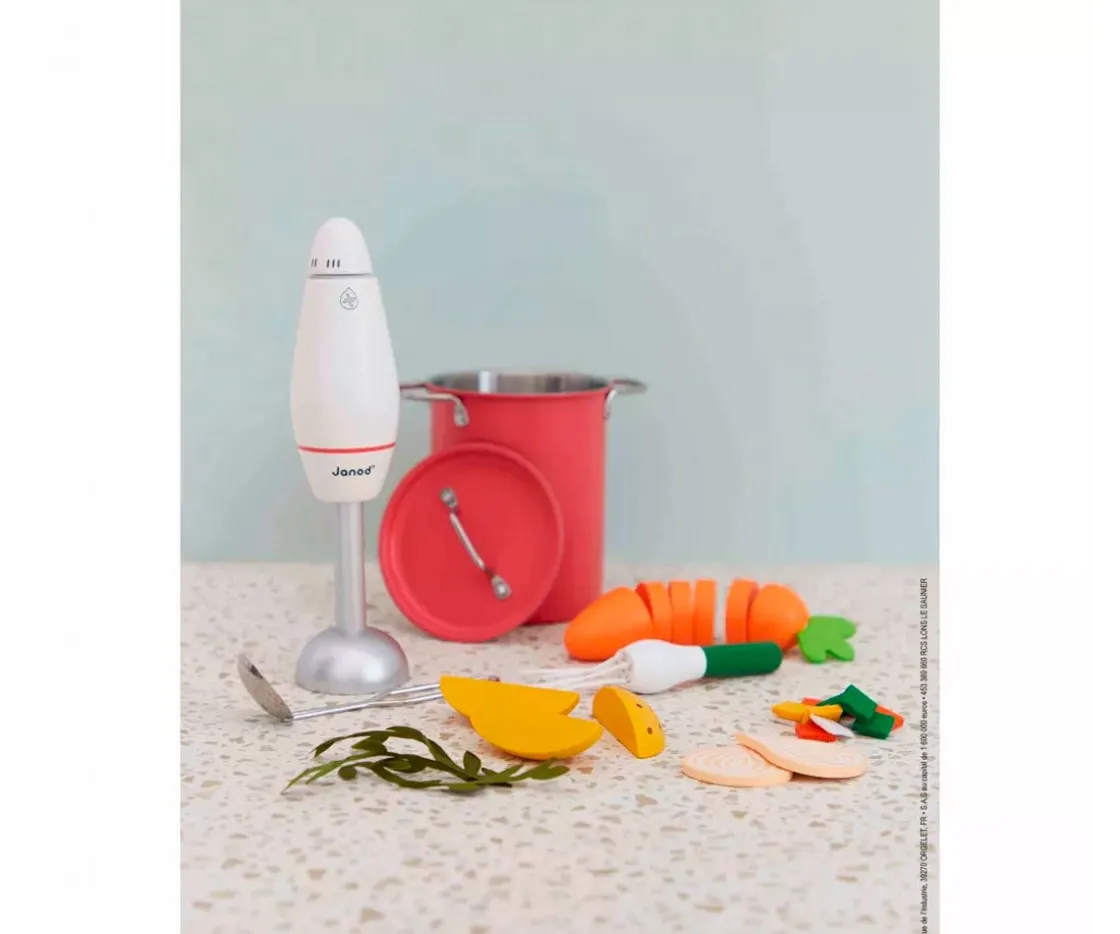 - Incluye: puerro, zanahorias, patatas, cebollas de palo, ramitas de hierba de fieltro y un paquete de pasta, batidora, olla y cucharón