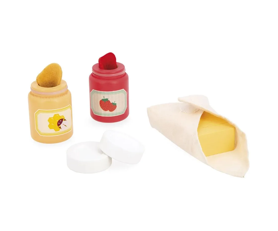 - Incluye: 1 tarro de mermelada, 1 tarro de miel, 1 plato, 1 cuchillo, 1 trozo de mantequilla para cortar, 2 rebanadas de pan, 2 trozos de fieltro (mermelada y miel) y, por supuesto, ¡una tostadora!