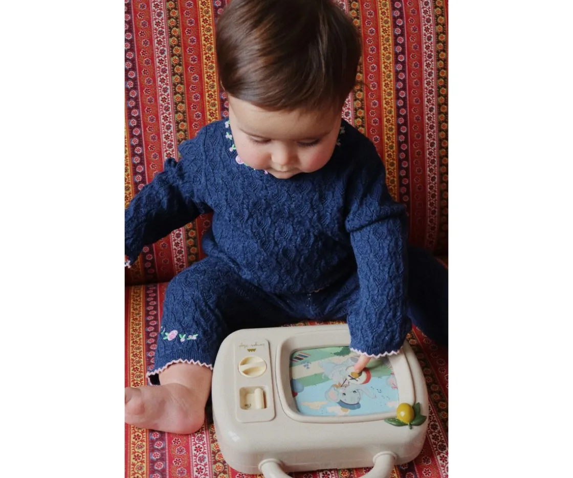 Un encantador juguete musical de Konges Slojd diseñado para entretener a los peques con sus sonidos y movimientos. Al girar el botón en sentido contrario a las agujas del reloj, se activa una pantalla móvil.