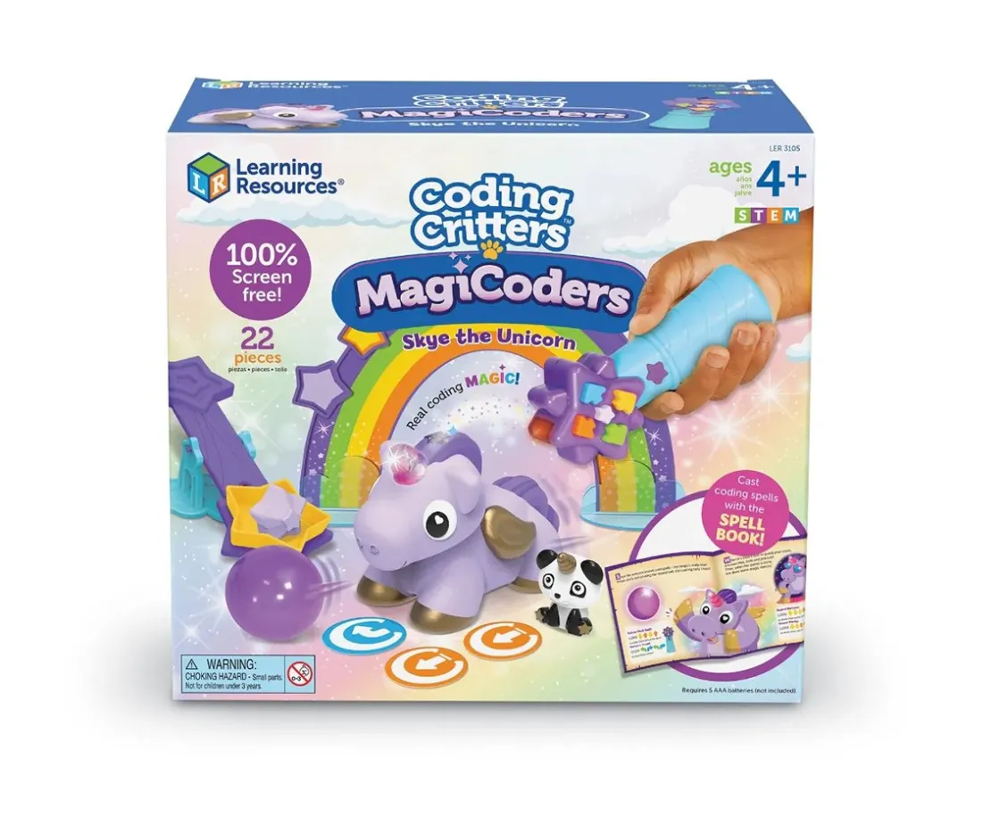 Los peques podrán codificar sus movimientos y emociones mientras se divierten. Skye se desplaza, busca su bola, cambia el color de su cuerno según su estado de ánimo y responde a hechizos lanzados con su varita mágica. Incluye un libro de hechizos con desafíos interactivos y un set de 22 piezas para crear aventuras mágicas y desarrollar habilidades de programación de forma divertida.