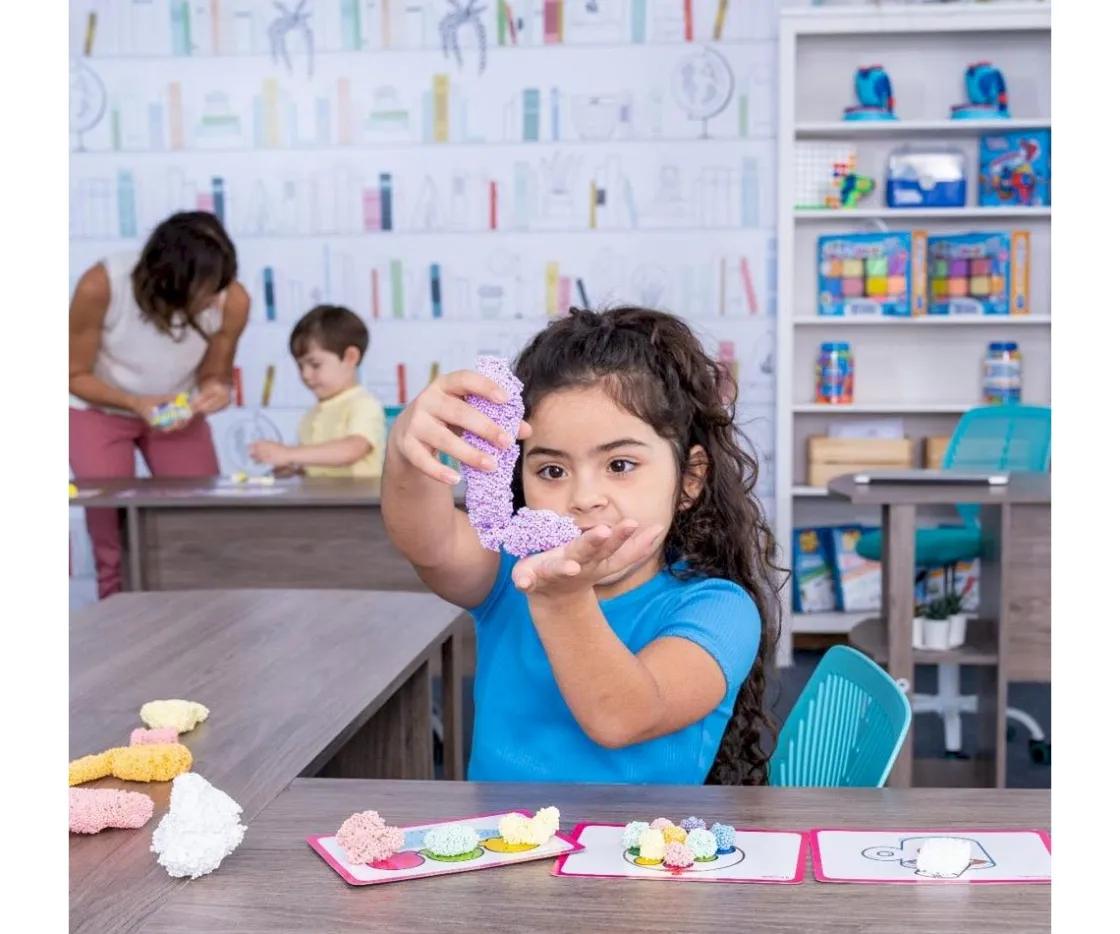Este set está formado por tarjetas con coloridos objetos y formas y ocho ladrillos de Playfoam de colores moldeable con los que pueden familiarizarse con los números y las cantidades.