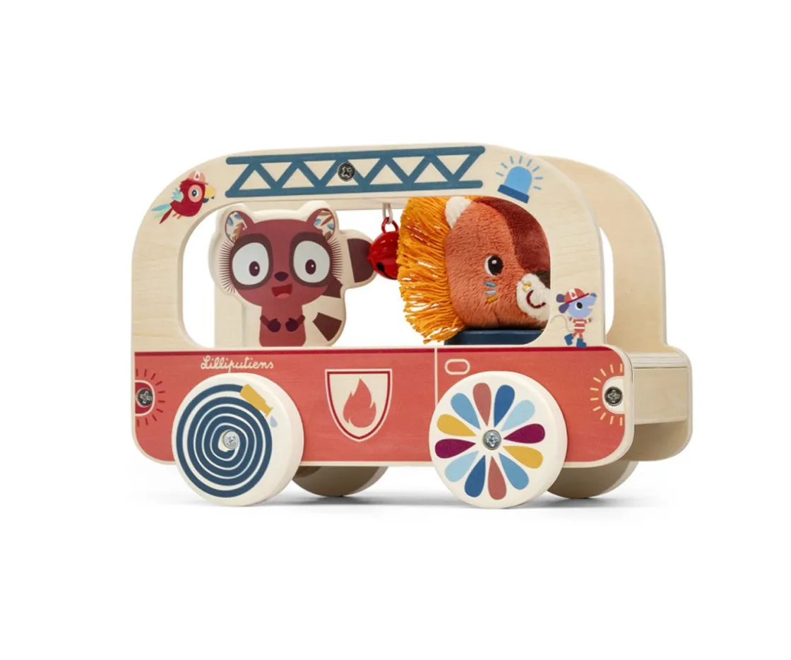 - Incluye: camión de bomberos de madera, Jack el León, Elvis el Lémur