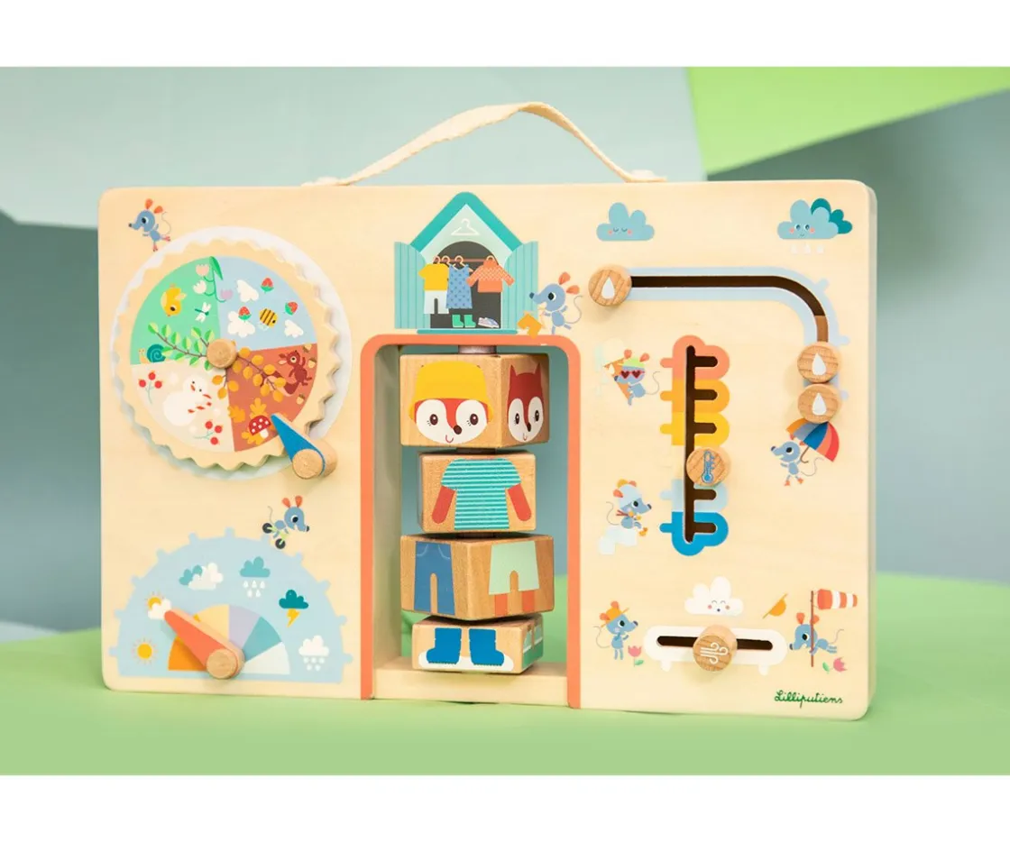 Con esta bonita maleta de Lilliputiens, los peques aprenderán sobre las 4 estaciones, cómo vestir a Alice según el clima: frío, calor, viento o lluvia. Tendrán que ir indicando la intensidad de lluvia, de sol y en qué estación nos encontramos.